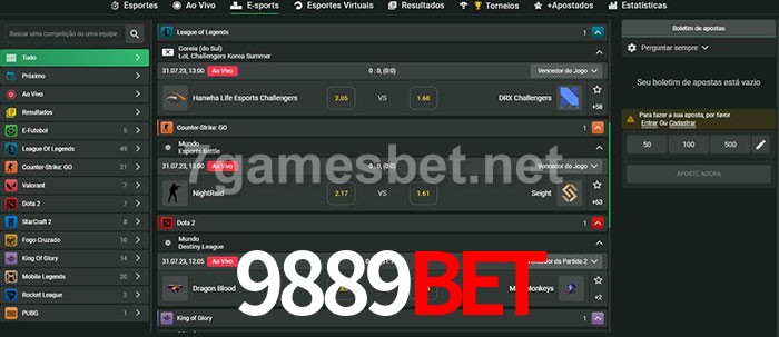 O 9889Bet oferece uma grande seleção de opções de apostas em e-sports com probabilidades competitivas